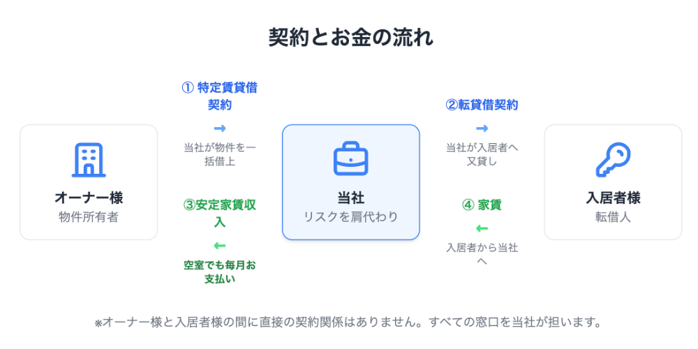 当社が一括してお部屋を借上し入居者の有無に関わらずオーナー様に毎月家賃をお支払いするシステムです。 これを特定賃貸借契約(マスターリース契約)と言い、当社が賃貸住宅の賃貸借契約することです。