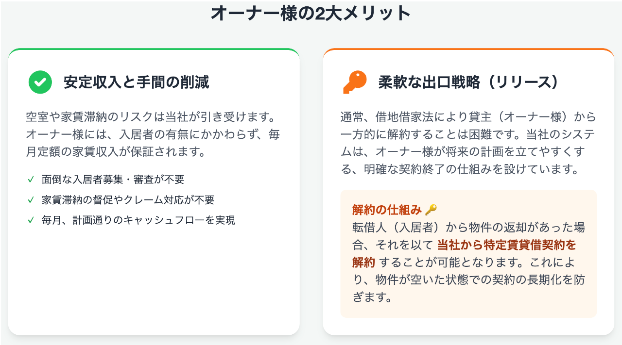 一般に特定賃貸契約は貸主から解約することが出来ませんが、当社は転借人からの返却をもって解約することが出来ます。